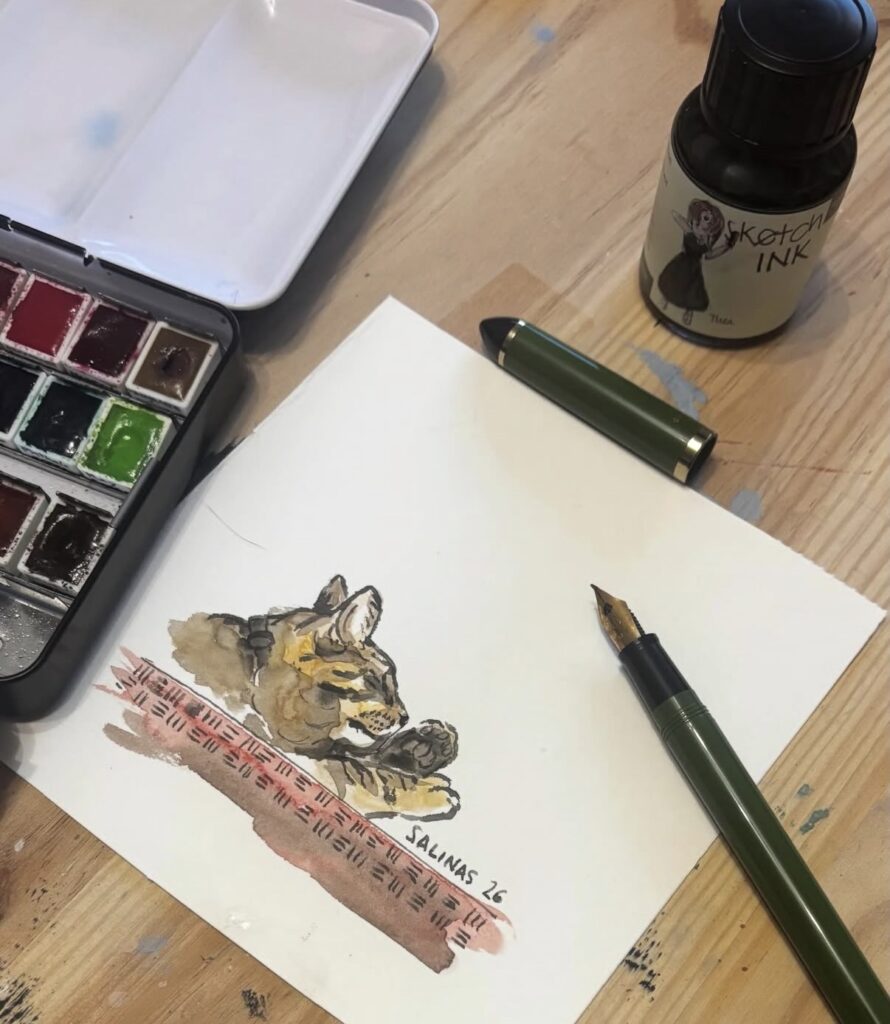 Basquiat, el gato de la artista, es fuente de inspiración en sus últimas creaciones. Aquí, probando su pluma Sailor Fude de Mannen.