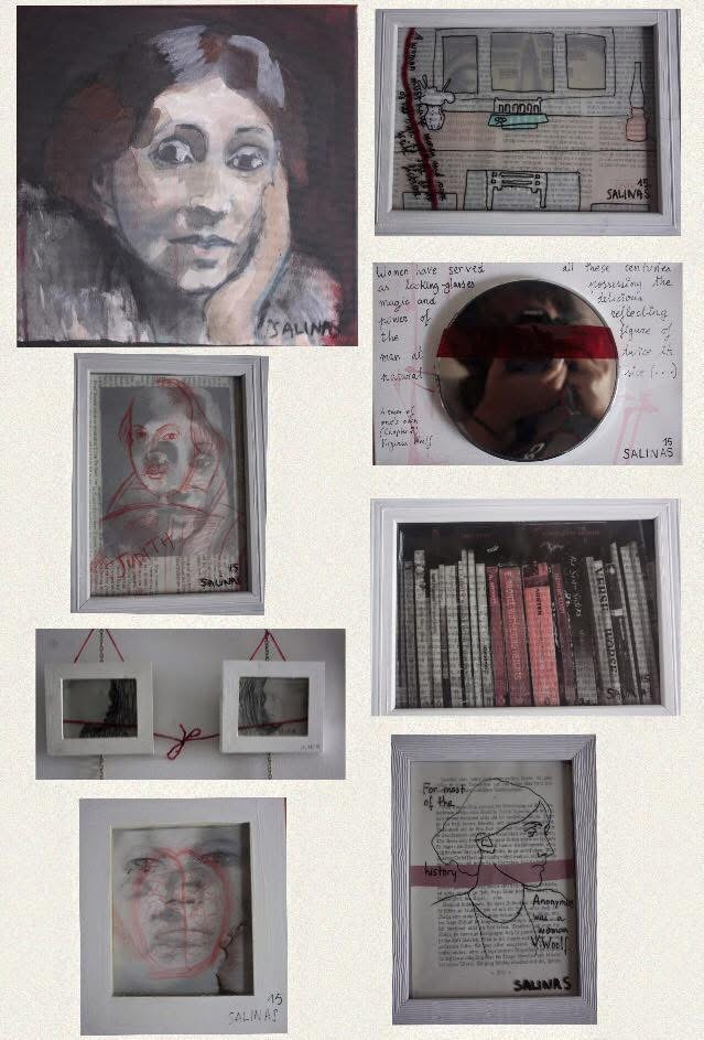 Para esta exposición, Clara Salinas eligió a «tres mujeres que me marcaron profundamente»: C. P. Gilman (El papel pintado de amarillo), E. Parkhurst (Libertad o muerte) y Virginia Woolf (Una habitación propia).