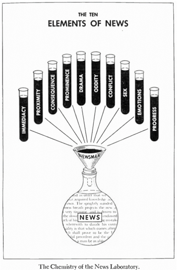 En este manual, difundido en España en 1975 —el año no es casual— con el título Géneros periodísticos informativos: nueva enciclopedia de la noticia (ATE), el periodista estableció diez «criterios de noticiabilidad». Este listado de atributos que deben contener los hechos para convertirse en noticia se tradujo así: immediacy (actualidad), proximity (proximidad), consequence (consecuencias), prominence (relevancia personal), drama (suspense), oddity (rareza), conflict (conflicto), sex (sexo), emotions (emoción)y progress (progreso).